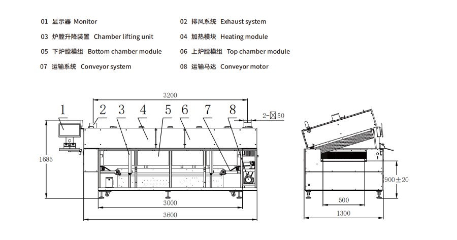 | 1.可選:機(jī)頭機(jī)尾可凸出,凸出上爐膛外側(cè)面尺寸300mm(整機(jī)尺寸會(huì)加長(zhǎng)600mm)。 2.注明:根據(jù)產(chǎn)能要求,推薦溫區(qū)數(shù)量?jī)?yōu)先選擇:4溫區(qū)、5溫區(qū)、 8溫區(qū)、9溫區(qū)、10溫區(qū)、12溫區(qū),可定制。 | |||