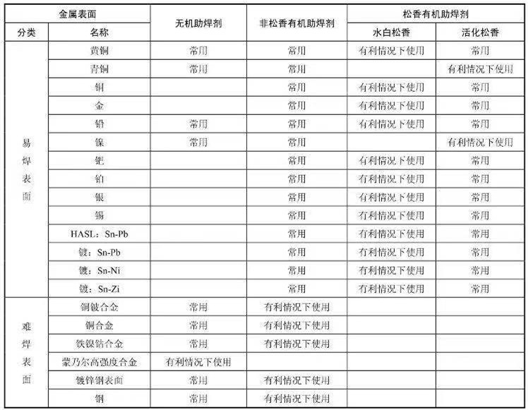 ?、谟欣麠l件下使用:在表面無嚴重的銹膜或類似的污染時,可用水白松香助焊劑。通常這類金屬表面可用活化松香或非松香有機材料助焊劑進行焊接。